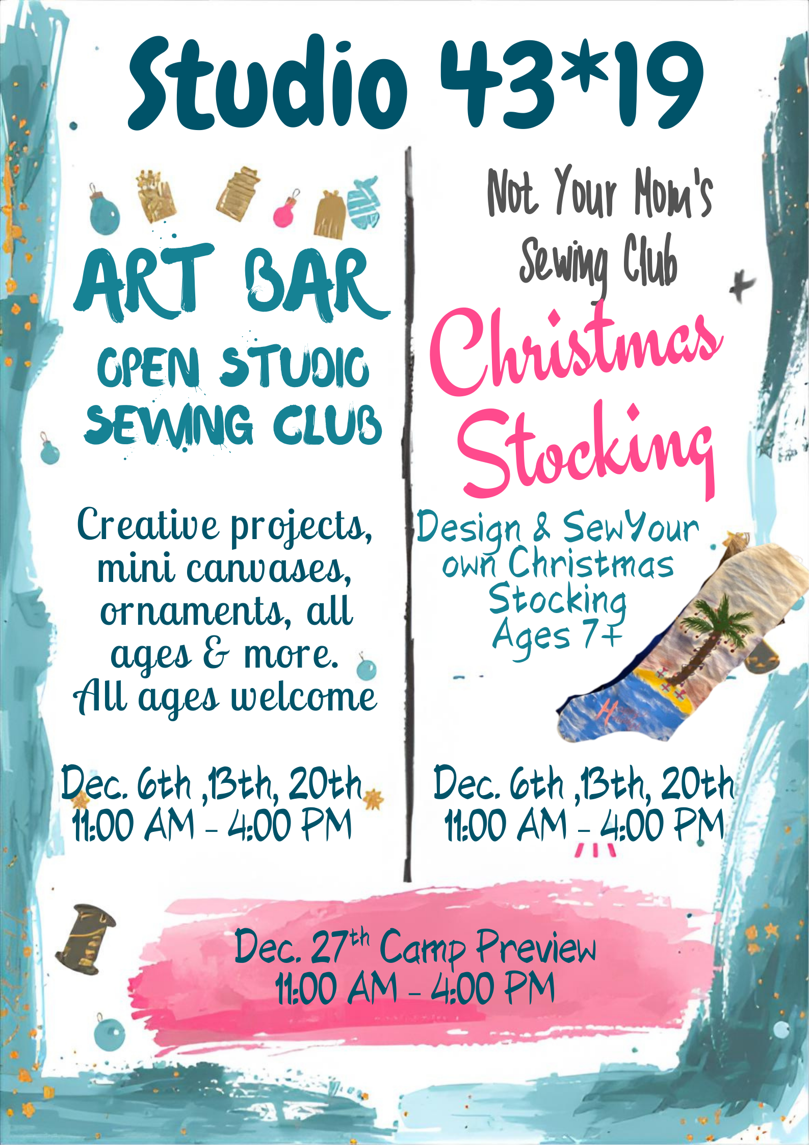 Dec 6th and 13th -Ornament Art Bar and Sew and design your own Christmas Stockings
